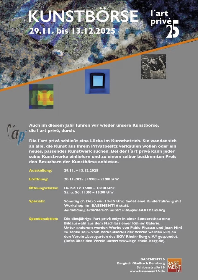 Das Künstlerforum Bonn präsentiert eine Auswahl aus der beeindruckenden Sammlung von Marcel Bouziri. Über mehr als vierzig Jahre hat der Bonner Geschäftsmann mit großer Leidenschaft über tausend Werke aus Malerei, Grafik und Skulptur zusammengetragen. Die Ausstellung zeigt die künstlerische Vielfalt der Bonner Szene und spannt den Bogen über mehrere Jahrzehnte lokaler Kunstgeschichte.
